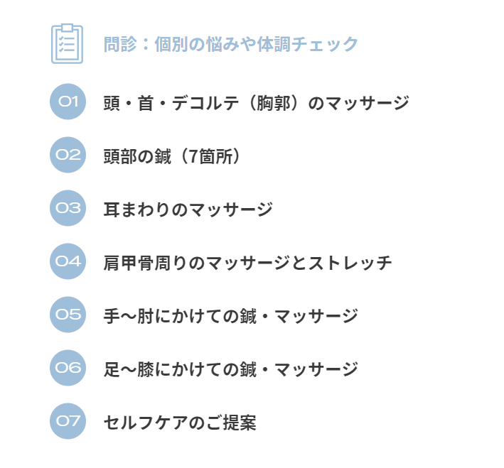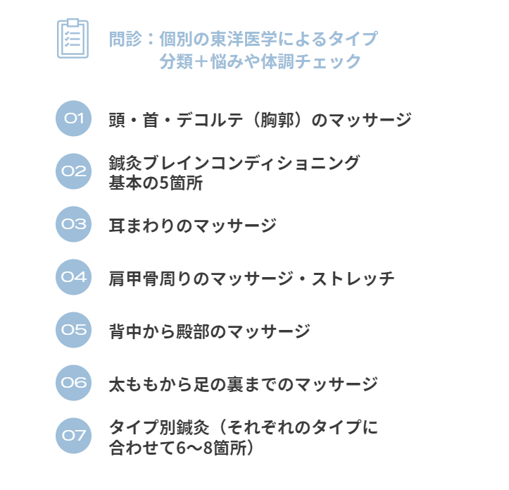 2つのコースの大きな違いは、お灸の有無と背中の施術の有無でしょうか。