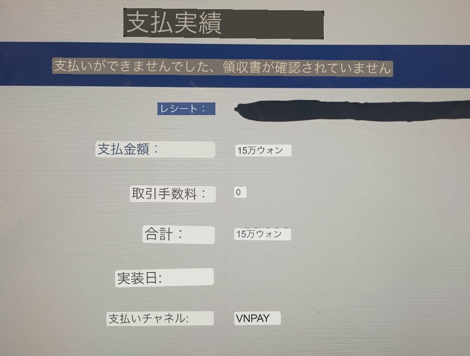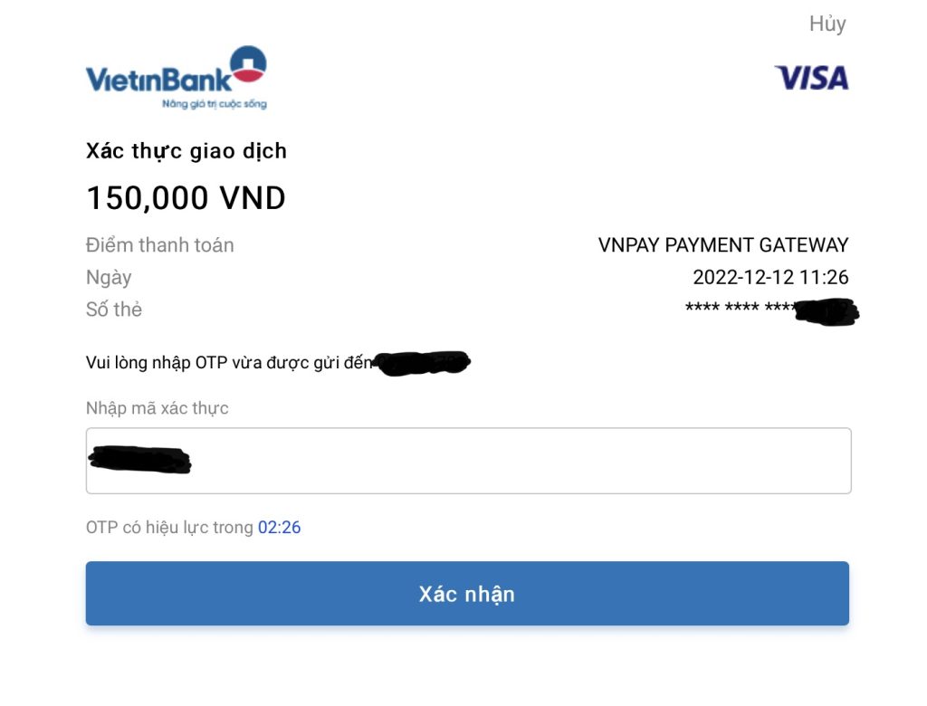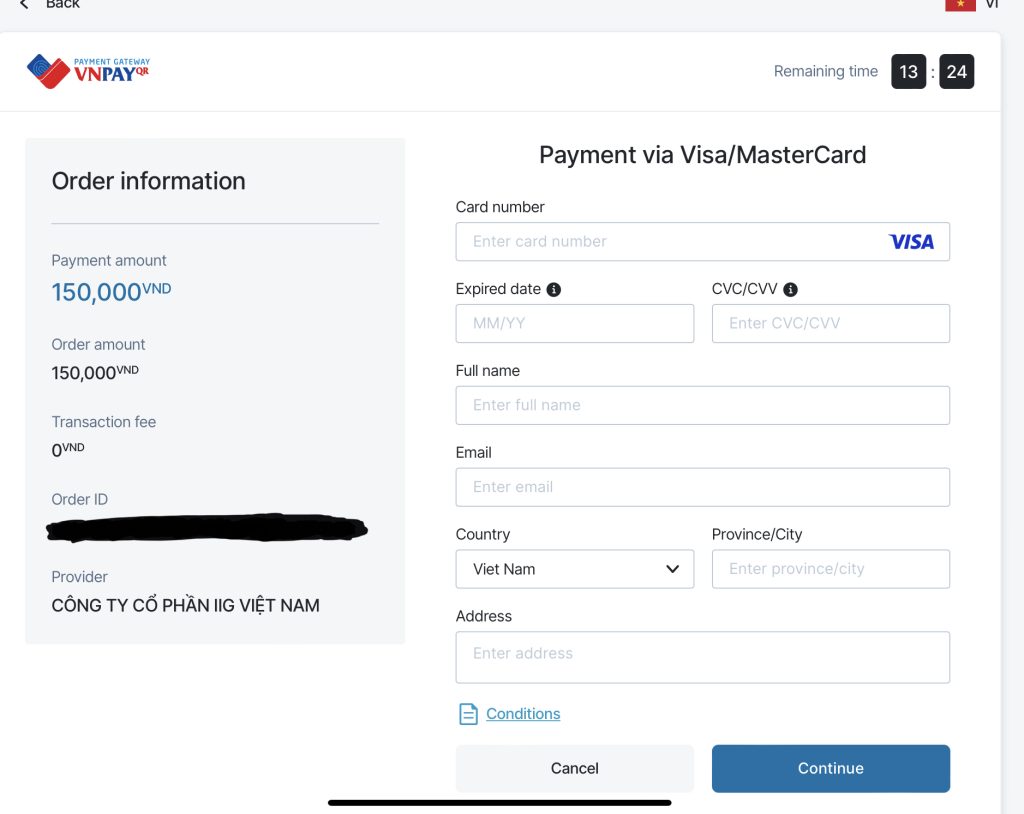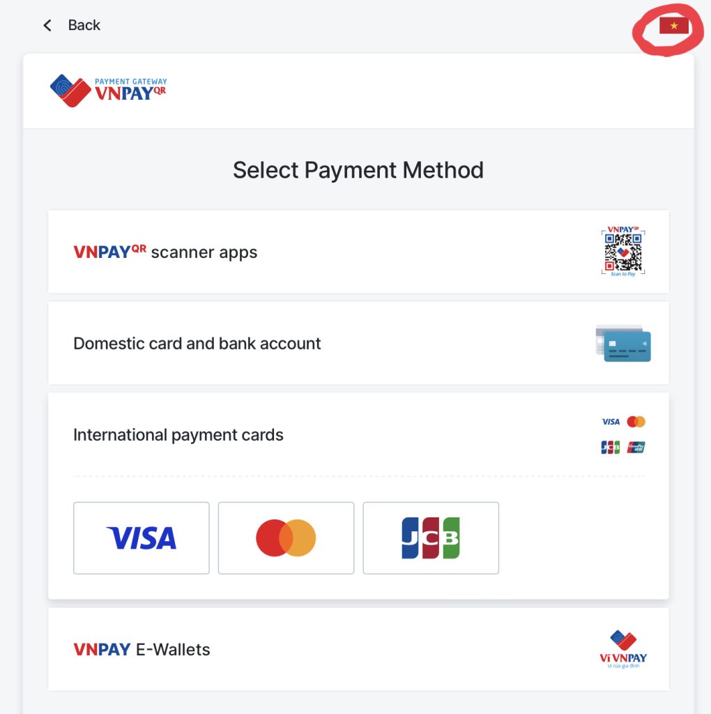 支払いには、銀行口座払いやクレジットカード (Visa, Master, JCB)、VNPAYが利用できます。