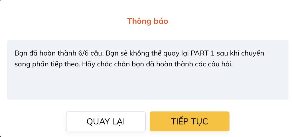 ですがこのMock Testでは、リスニングパートでも ”次に進む” ボタンを押さないと次に進みません!ただ待っているだけでは時間だけが過ぎていくのでご注意ください!!