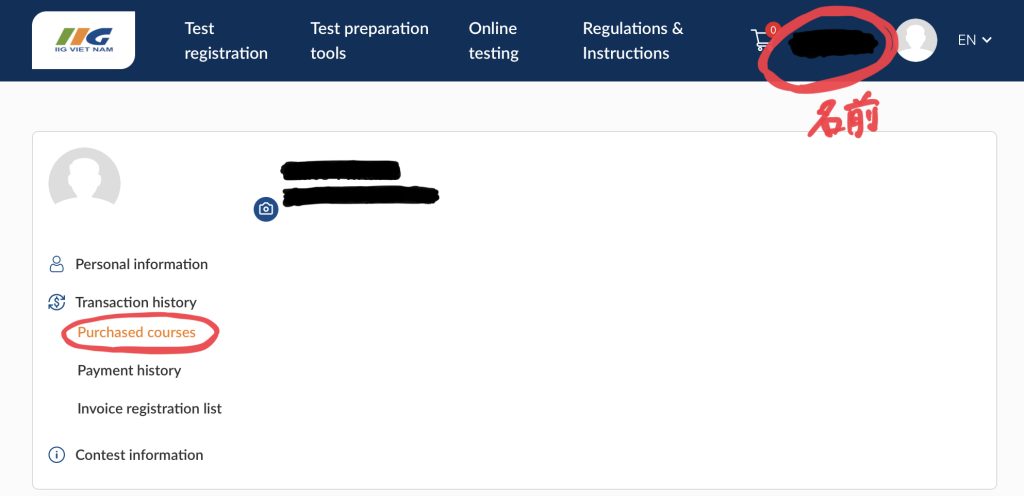 下記のようなアカウントページが表示されますので、Transaction history→Purchased coursesの順番でクリックしてください。