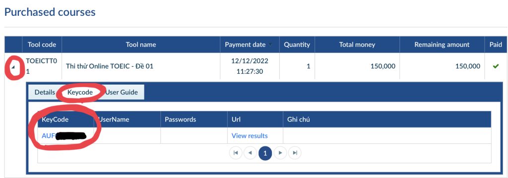 Purchased coursesの詳細画面が表示されたら、Tool code左の▶印を押して、Keycodeタブを選択します。